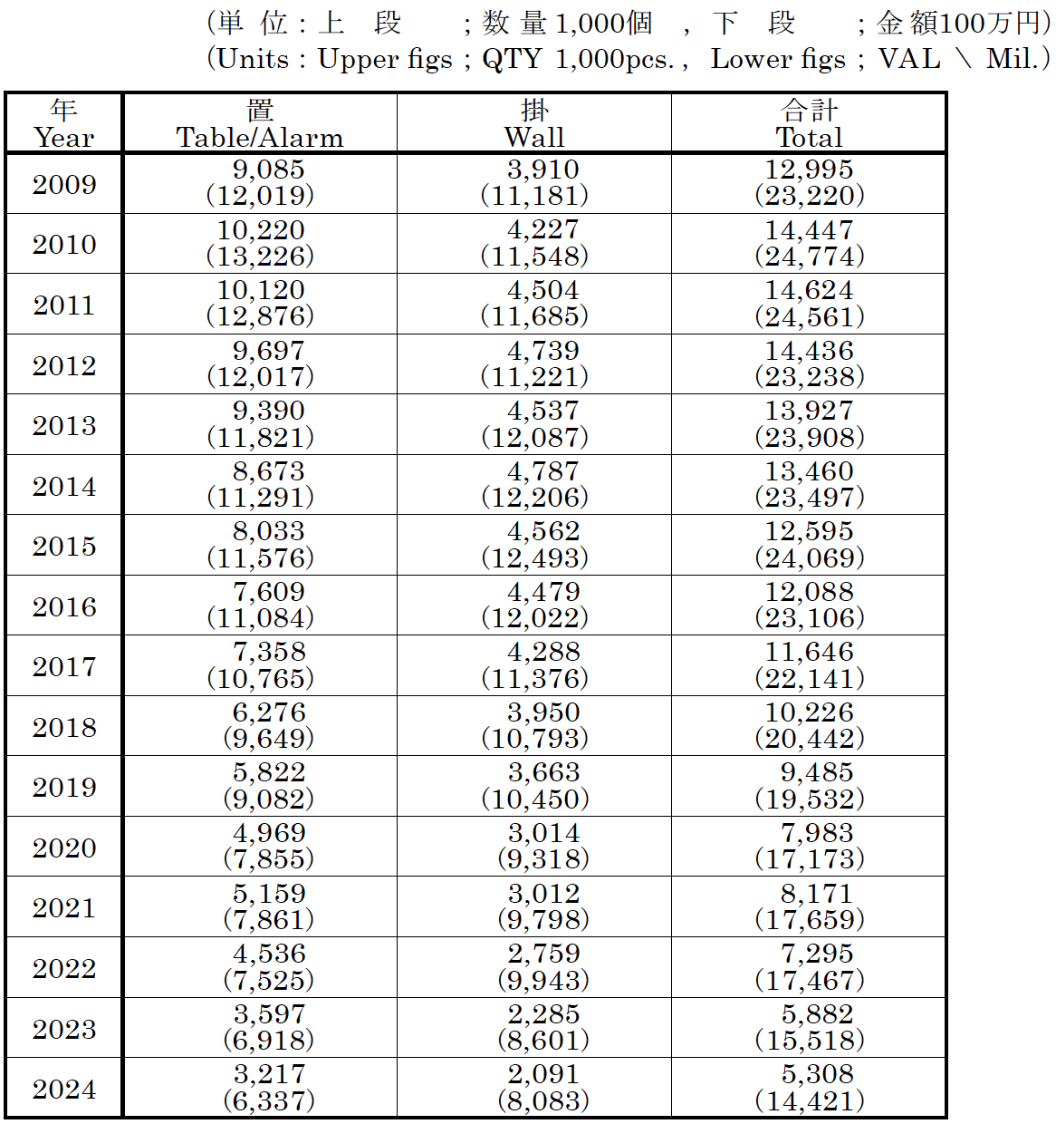 - 2.時計完成品の総出荷(輸出+国内出荷)の推移(2009年~2024年)