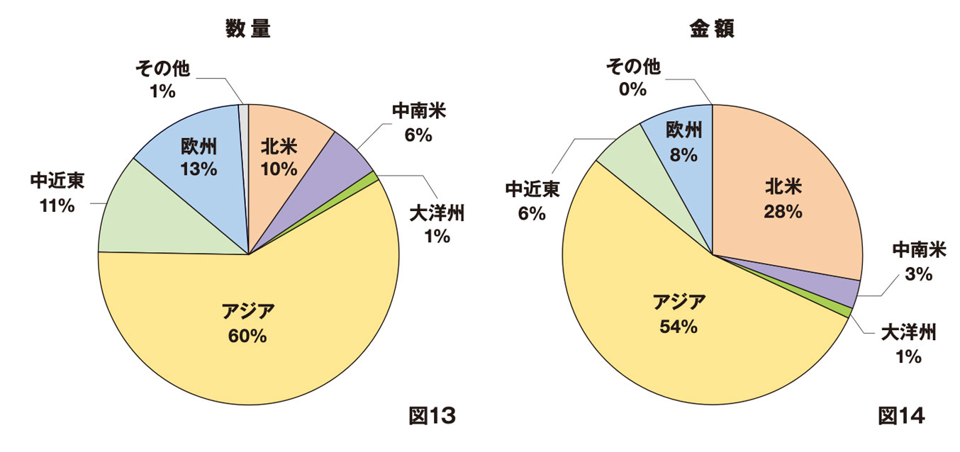 - 完成品の主な輸出先の対前年金額比較では、欧州が4%増に対し、北米は5%減、アジアは10%減であった。